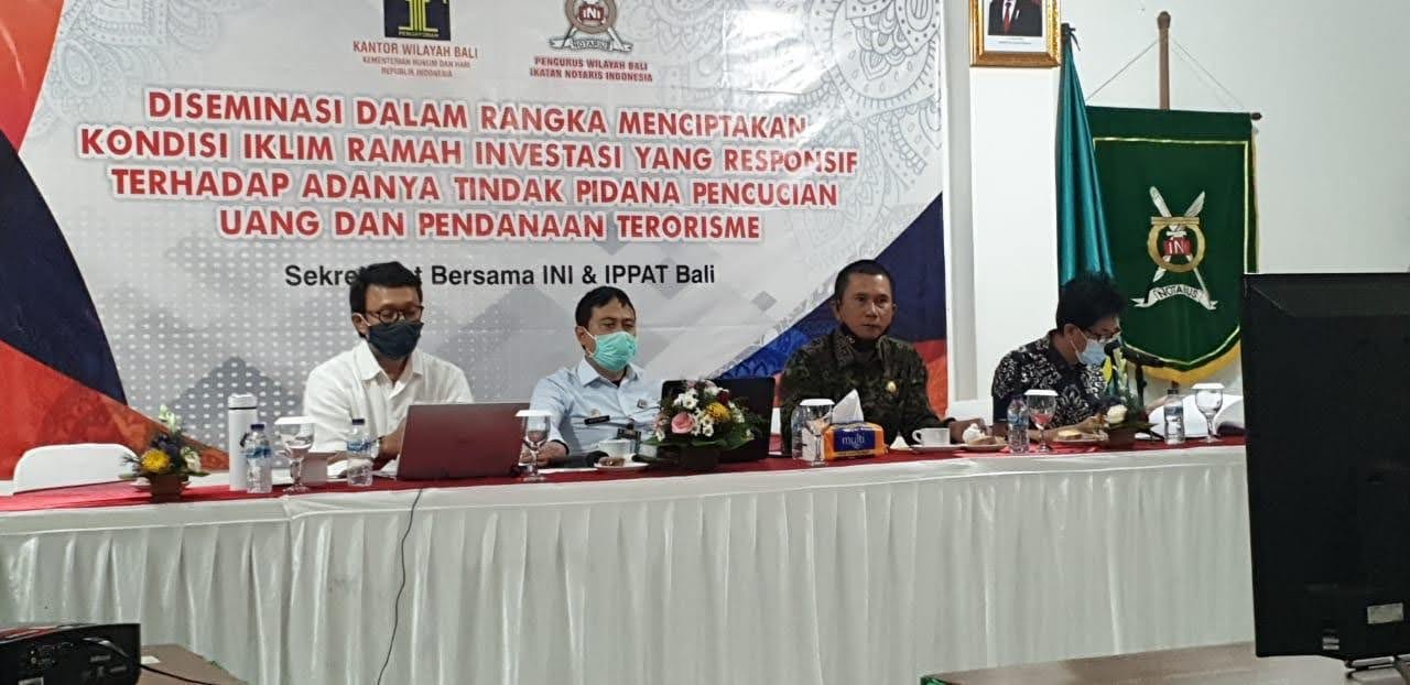 Denpasar-Pengwil Bali Ikatan Notaris Indonesia (INI) bersama-sama dengan Kanwil Kementrian Hukum dan Hak Asasi Manusia Provinsi Bali mengadakan acara Diseminasi dengan tema " Diseminasi Dalam Rangka Menciptakan Kondisi Iklim Ramah Investasi Yang Responsif Terhadap Adanya Tindak Pidana Pencucian Uang dan Pendanaan Terorisme". Acara ini diadakan secara langsung melalui media Zoom yang di saksikan oleh 400 orang notaris seluruh bali.